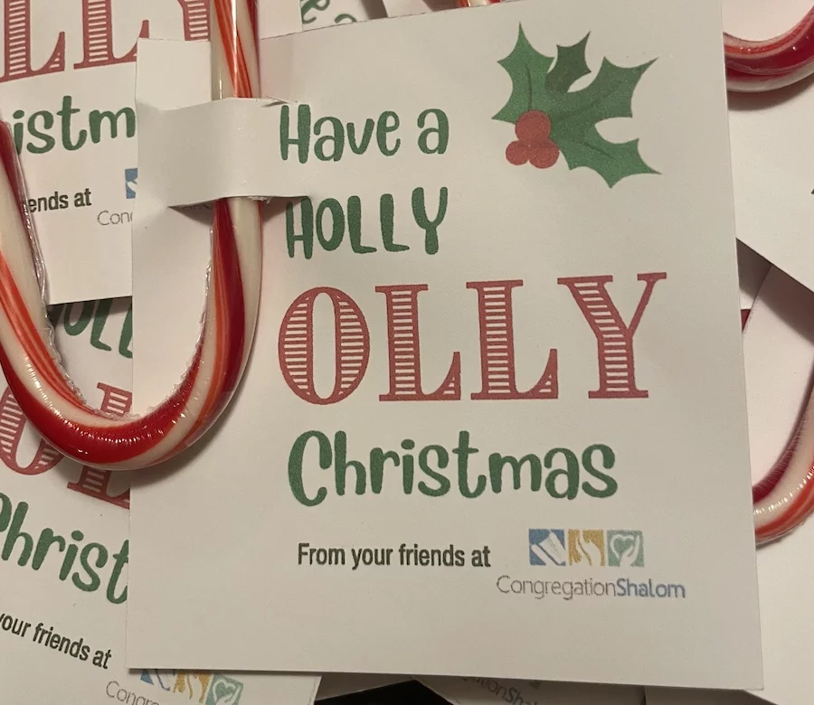 On Christmas Day, while the volunteer crew was setting up and preparing the food, another resident came into one of the rooms where the meal would be served. She has been attending the Christmas Meal for years but in the past few years she has been joining her son and his wife. She came in to say “Hello” and to thank Congregation Shalom for all their hard work in offering the Christmas meal. She shared how her son was going to pick her up in a little while but she just wanted to stop by and visit for a short time. As other residents joined us for the meal and were already sitting down and starting to eat, this woman came back into the room and announced that in fact she would be joining us this year. Unfortunately, at the last minute, her son was not able to have her over and she ended up with nowhere to go for Christmas. We immediately got her a seat, a nametag, a festive candy cane and a hot plate of food. Though she was disappointed that her plans had changed, she was later seen talking and laughing and enjoying her time with the other residents and our temple crew.