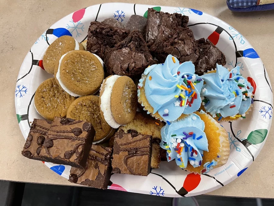 Each location worked to reheat, cook, plate/create to-go boxes. A group of volunteers headed out to deliver the meals with great cheer and merriment while the rest of the crew worked to serve a plated meal and offer companionship and joy. Each resident was given an individual homemade holiday card created by a group of children and a festive candy cane message from Congregation Shalom. There was laughter and conversation and lots of eating of the delicious food.